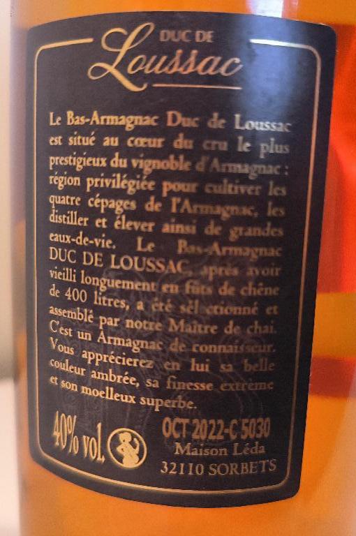 1 bouteille de Bas-Armagnac Duc de Loussac, VSOP. Localisation: 30 rue Beauregard 60440 Nanteuil-le-Haudouin.