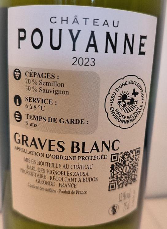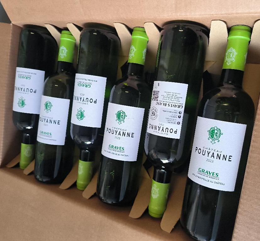 12 bouteilles de Graves Château Pouyanne, 2023. Bordeaux blanc. Caisse carton d’origine. Localisation: 30 rue Beauregard 60440 Nanteuil-le-Haudouin.