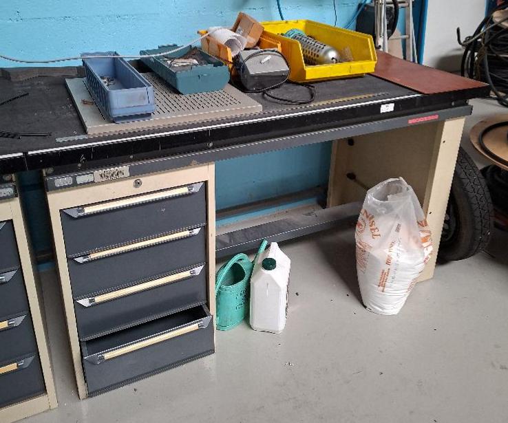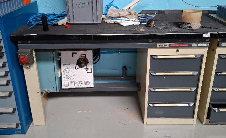 2 établis d’atelier avec caisson 4 tiroirs dont un avec prise électrique. 86 x 148 x 75 cm