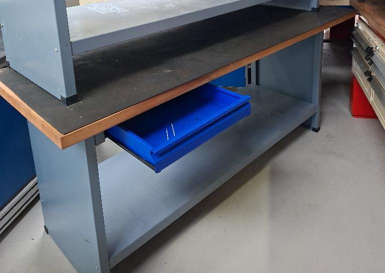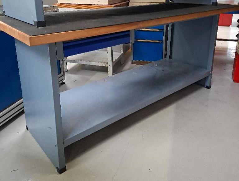 2 établis en acier laqué gris, plateau en bois, 1 tiroir en ceinture. 88 x 200 x 71 cm.