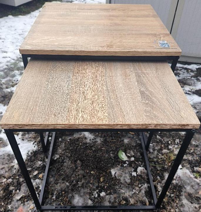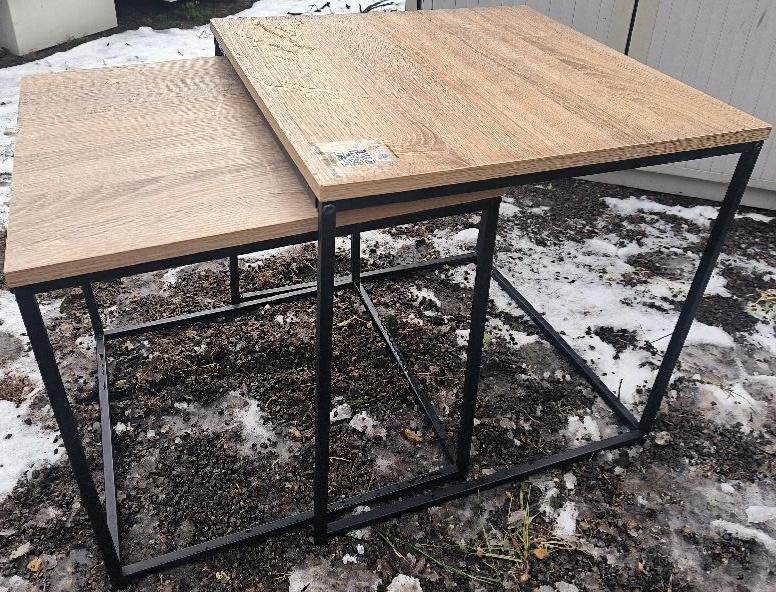 2 tables basses gigognes, plateau en bois de couleur hêtre, piètement en métal noir. Dim : 50 x 50 x 50 cm et 45 x 45 x 45 cm. Localisation : 30 rue Beauregard 60440 Nanteuil-le-Haudouin
