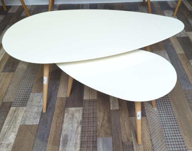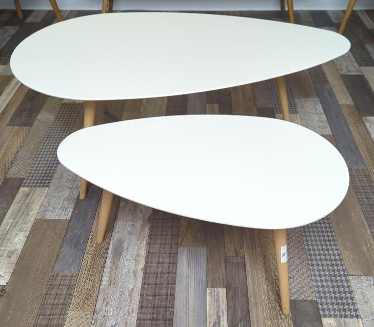2 tables gigognes à plateau ovoïde en bois stratifié blanc sur 3 pieds obliques en bois naturel. 44 x 116 x 66 cm et 39 x 75 x 42 cm. (bât H rdc HL149)