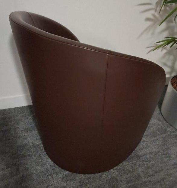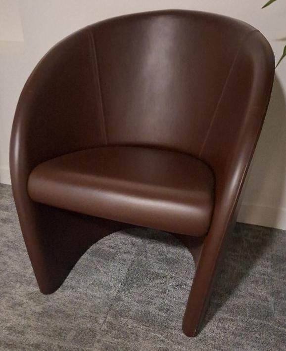 3 fauteuils design Massimo et Lella Vignelli modèle Intervista édition Poltrona Frau recouverts de cuir marron. 82 x 70 x 66 cm. 3 unités dont 1 abîmé et 1 usé aux pieds. Localisation: 38 rue de Lamirault – 77090 Collégien
