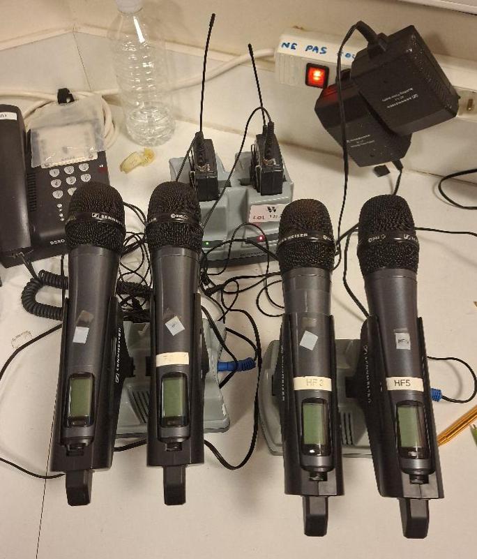 4 micros de marque Sennheiser modèle e935 avec base et batterie modèle L2015. Localisation: auditorium
