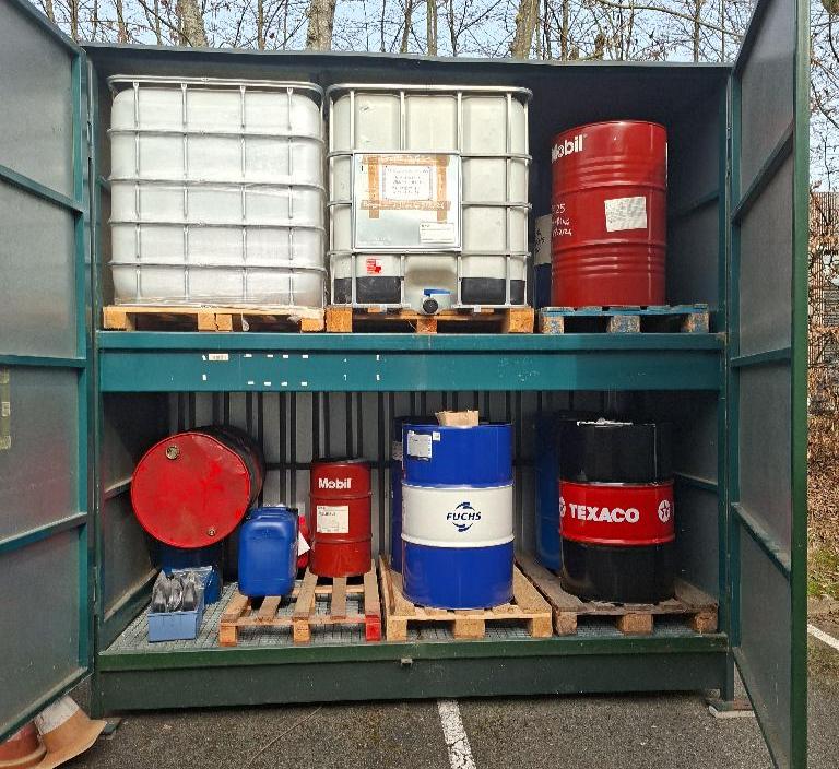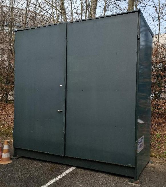 Armoire de stockage de produits chimique avec bacs de rétention de marque Delphi. 300 x 300 x 135 cm. (vendue vide de fûts)