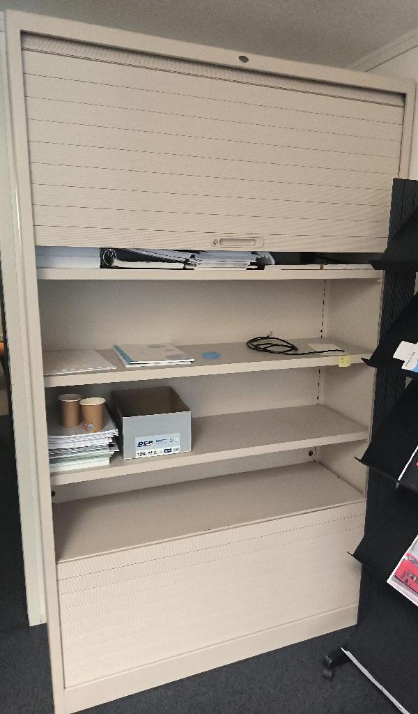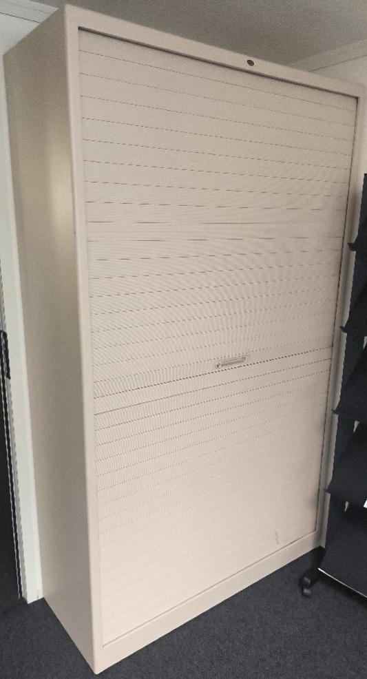 Armoire haute métallique de marque Jec, 1 porte rideau à ouverture centrale de couleur beige. Dim : 197 x 120 x 45 cm. 40 UNITÉS AU TOTAL. (étiquette 5038)
