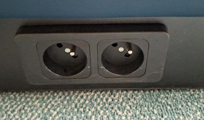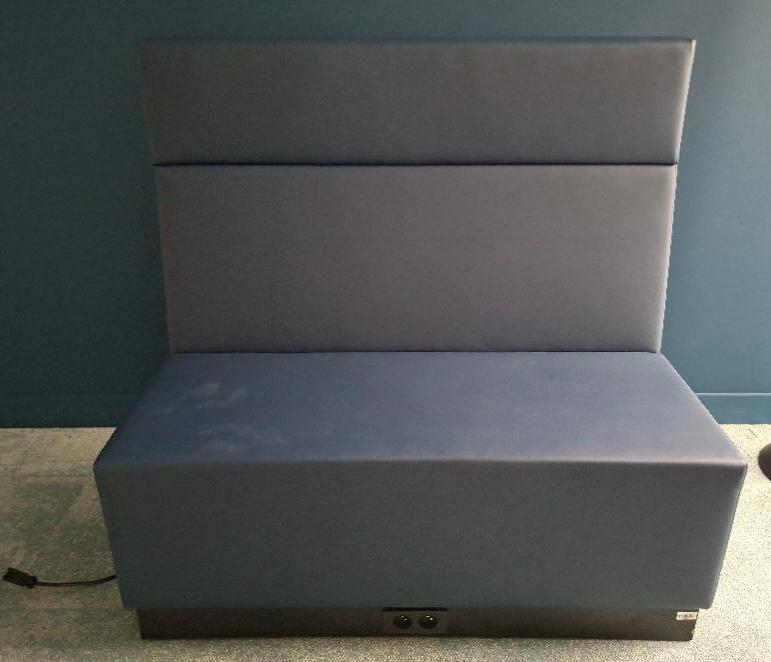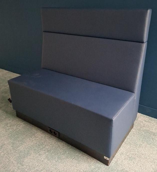 Banquette à haut dossier de marque Ahrend recouverte de simili cuir bleu marine, socle en bois noir avec 2 prises électriques. 116 x 120 x 63 cm. 4 unités. Vendu à l’unité avec faculté de réunion. Localisation: Tour Coeur Défense – 92400 Courbevoie (TB5 7ème)