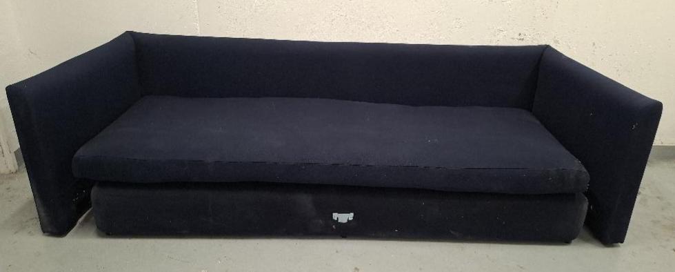Banquette de marque Hay recouverte de tissu bleu marine, piétement en bois noir. 76 x 230 x 85 cm. 2 unités. Vendu à l’unité avec faculté de réunion. Localisation: 5 rue des Italiens – 75009 Paris