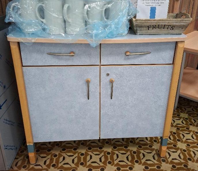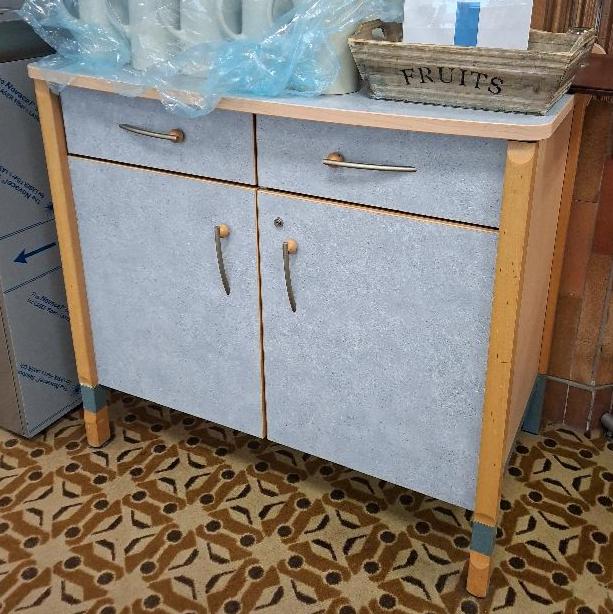 Buffet bas en bois stratifié moucheté bleu ouvrant par 2 tiroirs et 2 portes. 94 x 104 x 60 cm. 1 unité. Localisation: Rie
