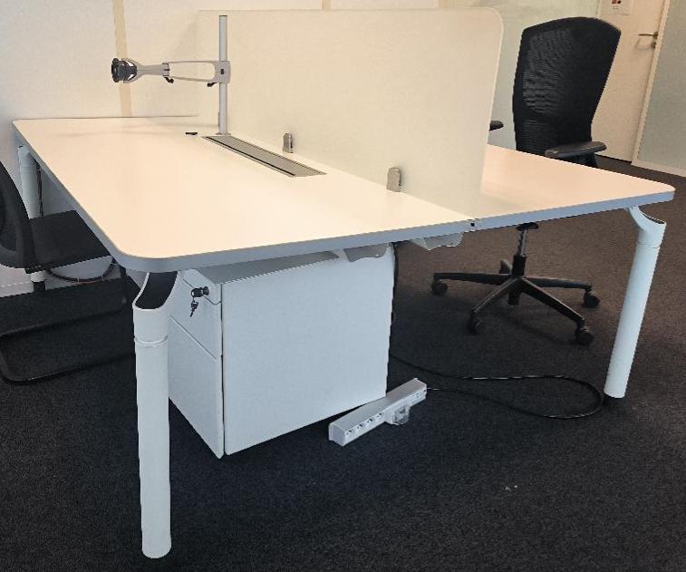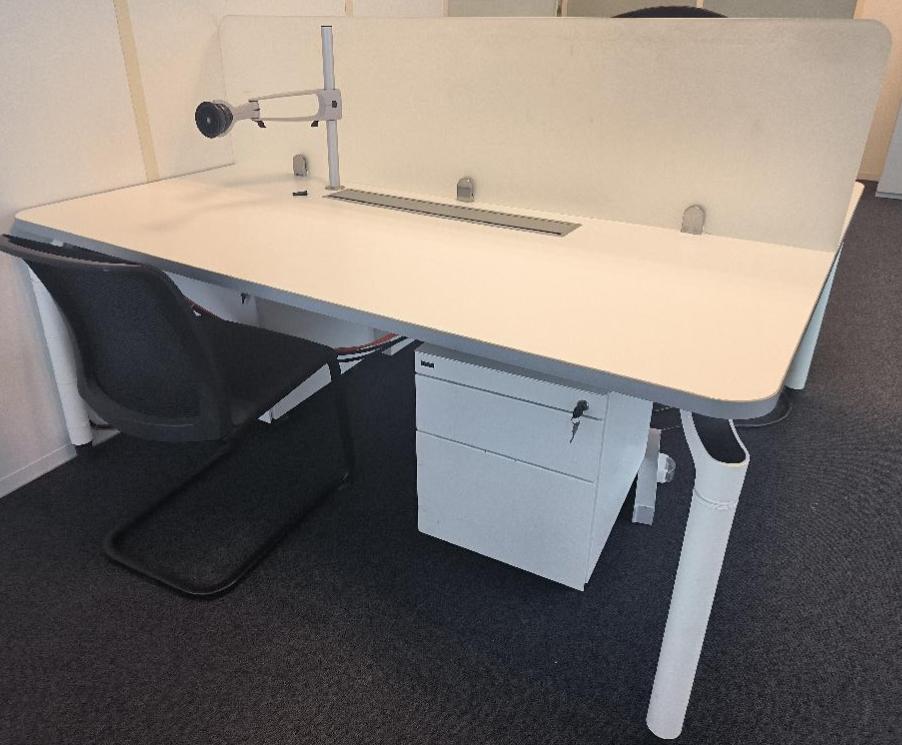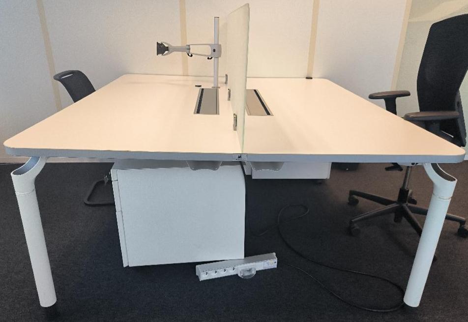 Bureau bench 2 personnes en face à face de marque Majencia, réglable en hauteur, plateau en bois de couleur blanc avec trappes, piétement en métal de couleur blanc. Dim : 73 x 180 x 160 (2×80) cm. 529 UNITÉS AU TOTAL. (étiquette 5003)