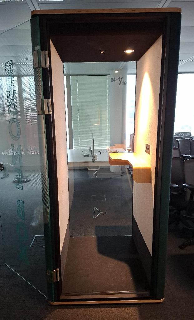 Cabine acoustique ventilée Phone Box de marque Ahrend avec tablette et prises électriques et usb. 225 x 99 x 98 cm. 2 unités. Vendu à l’unité avec faculté de réunion. Localisation: Tour Coeur Défense – 92400 Courbevoie (TB4 4ème)