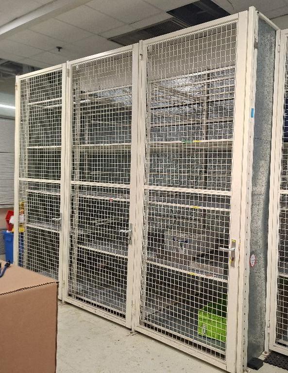 Cage en acier laqué blanc avec rayonnages, à démonter. 296 x 390 x 114 cm. 2 unités. Vendu à l’unité avec faculté de réunion. (rdj labo ML033)