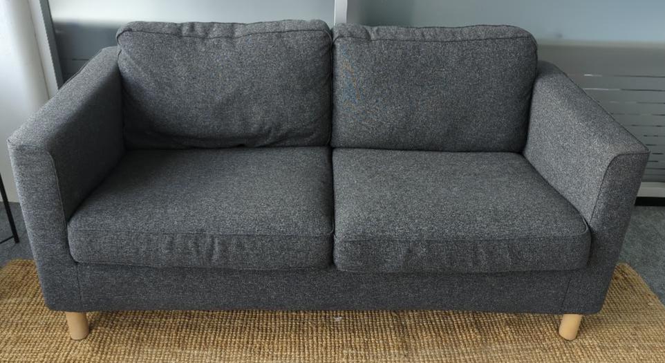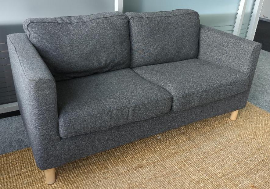 Canapé 2 places recouvert de tissu chiné gris, coussins amovibles et déhoussables, reposant sur 4 pieds en bois naturel. 82 x 164 x 80 cm. (bât M 2ème Ml210)