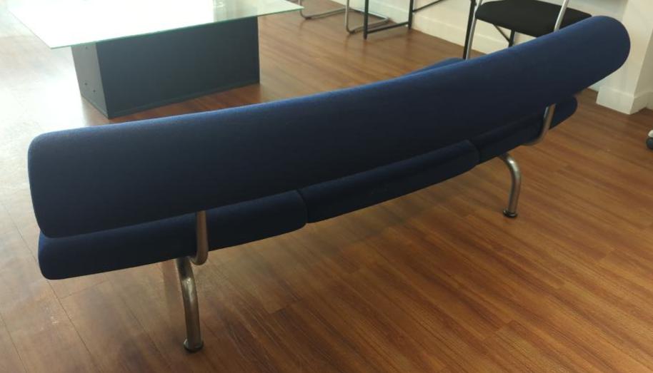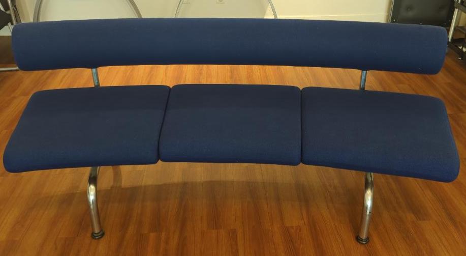 Canapé 3 places Erik Rorgensen recouvert de tissu bleu, cadre et piètement en métal. 75 x 190 x 70 cm. 2 unités. Vendu à l’unité avec faculté de réunion. (salle resto visiteurs n°3)