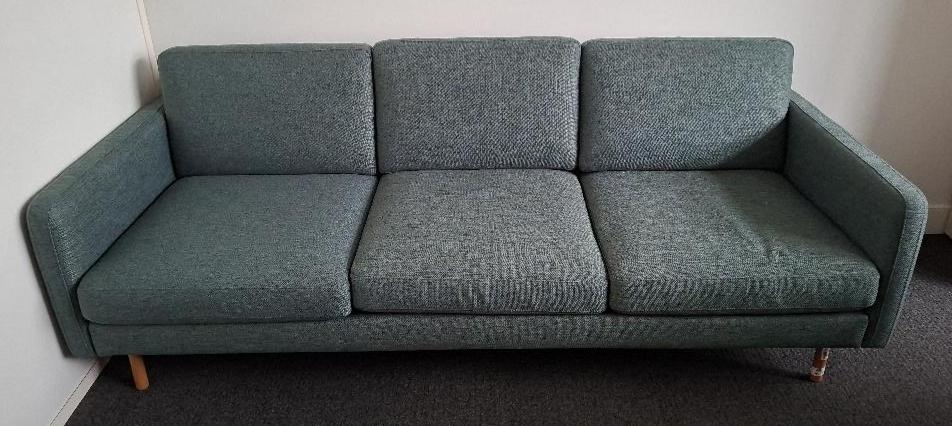 Canapé de marque Beolia recouvert de tissu chiné vert, piètement en bois naturel. 81 x 212 x 88 cm. Localisation: Tour Coeur Défense – 92400 Courbevoie (TB4 0)
