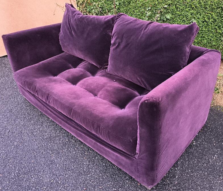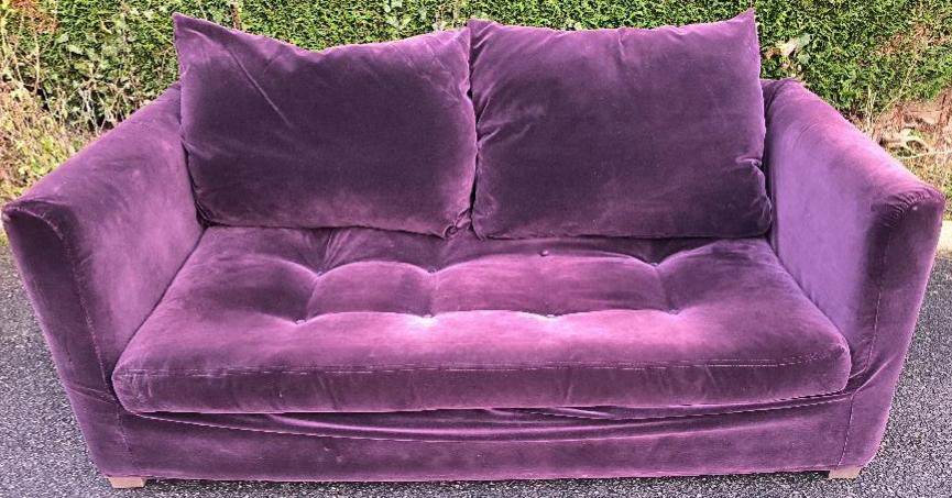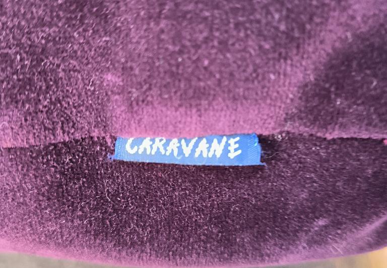 Canapé de marque Caravane recouvert de velours violet, piétement en bois, coussins de dossiers amovibles. 72 x 175 x 88 cm. Adresse de retrait : 30 rue Beauregard 60440 Nanteuil-le-Haudouin.