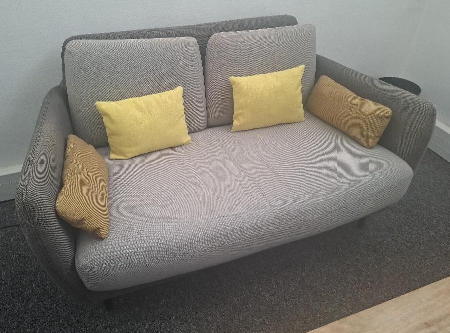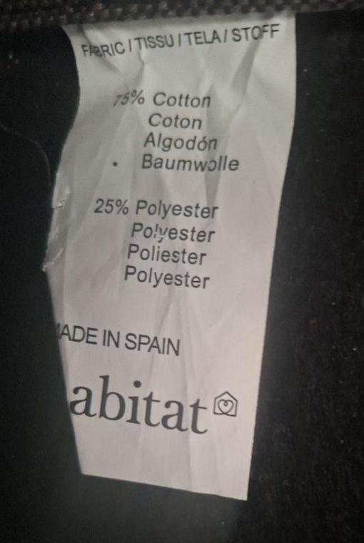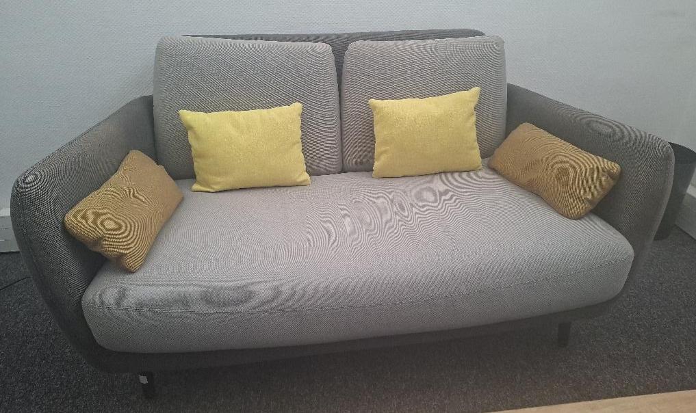 Canapé de marque Habitat recouvert de tissu gris, dossier et accoudoirs gris foncé, coussins d’assise et de dossier gris clair, pieds noirs. 78 x 145 x 90 cm (usures). Localisation: 30 rue Beauregard – 60440 Nanteuil-Le-Haudouin