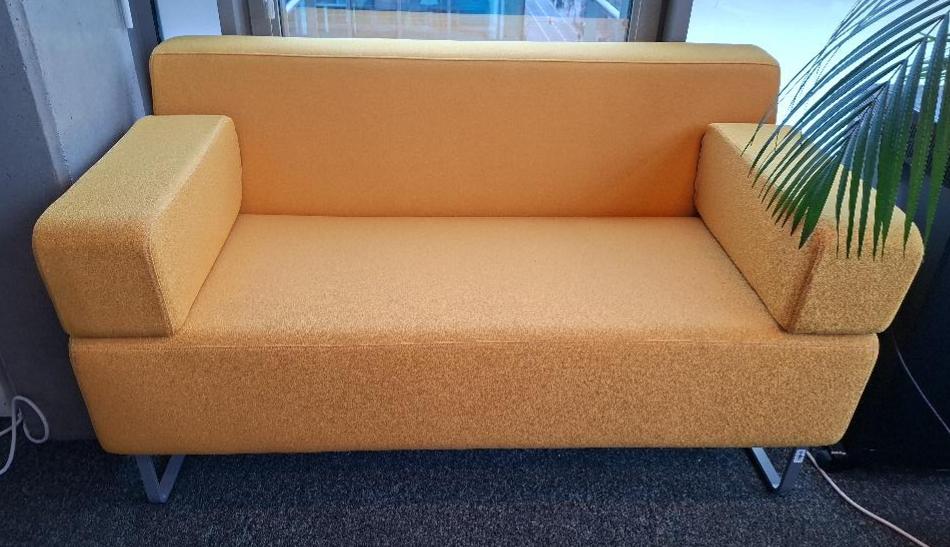 Canapé de marque Haworth recouvert de tissu jaune, piétement luge en métal chromé. 80 x 140 x 80 cm. Localisation: 19 rue Neuve Tolbiac - 75013 Paris (8ème étage) – Image 2