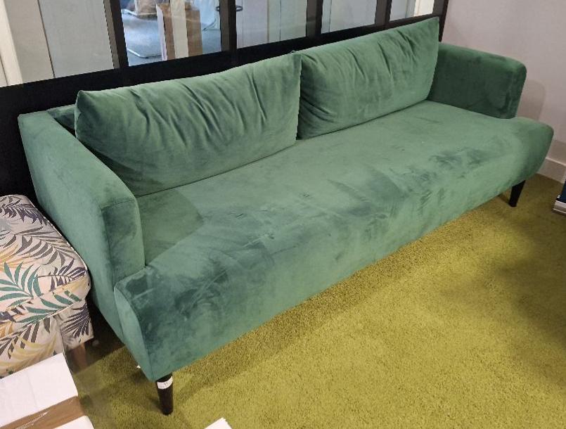 Canapé de marque Maisons du Monde recouvert de velours vert, piétement en bois noir, coussins de dossiers amovibles. 69 x 200 x 90 cm. (4ème). Localisation: 10 rue d’Arcueil – 94150 Rungis