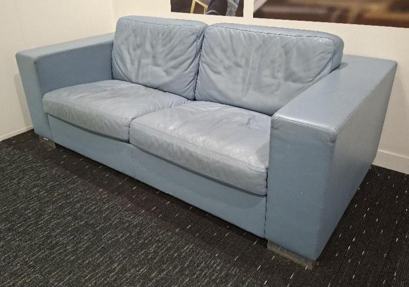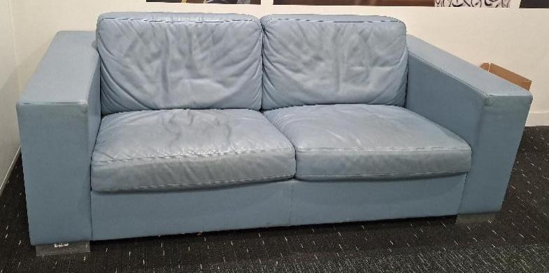 Canapé de marque Poltrona Frau en cuir bleu clair, coussins amovibles. 67 x 205 x 102 cm. (rdc). Localisation: 10 rue d’Arcueil – 94150 Rungis