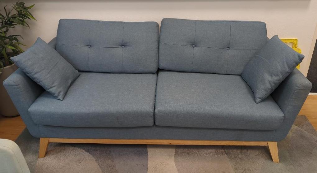 Canapé recouvert de tissu couleur bleu jean, coussins amovibles et déhoussables, piétement en bois naturel. 80 x 188 x 80 cm. (rdc HL131)