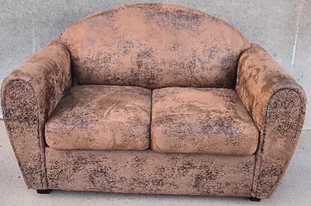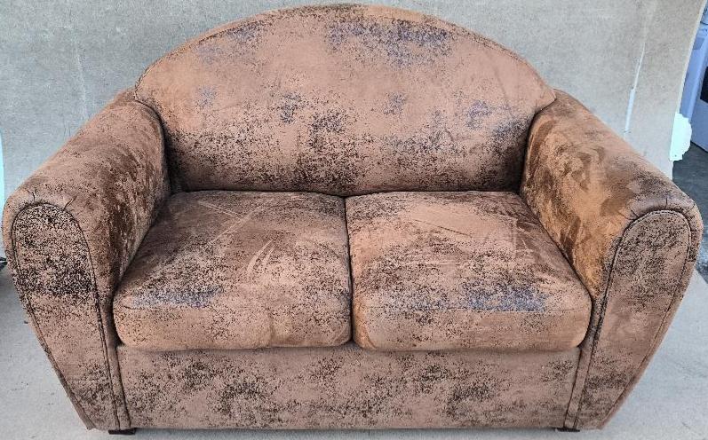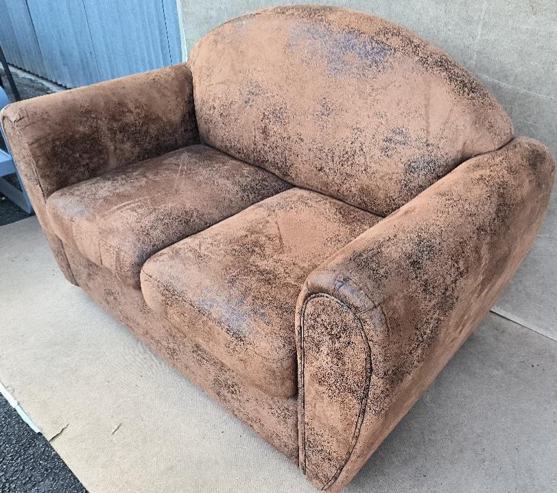 Canapé recouvert de tissu microfibre effet daim de couleur marron aspect vieilli. Dim : 90 x 140 x 80 cm. Localisation : 30 rue Beauregard 60440 Nanteuil-le Haudouin