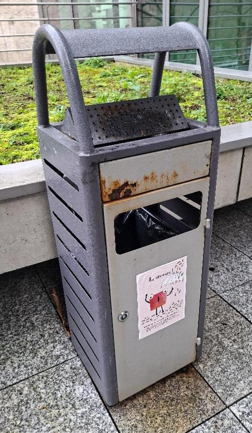 Cendrier / poubelle d’extérieur en métal (usures). 93 x 34 x 28 cm. 2 unités. Vendu à l’unité avec faculté de réunion. Localisation: 19 rue Neuve Tolbiac – 75013 Paris (extérieur)