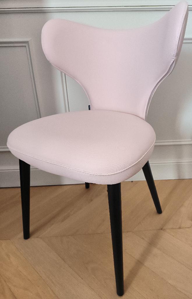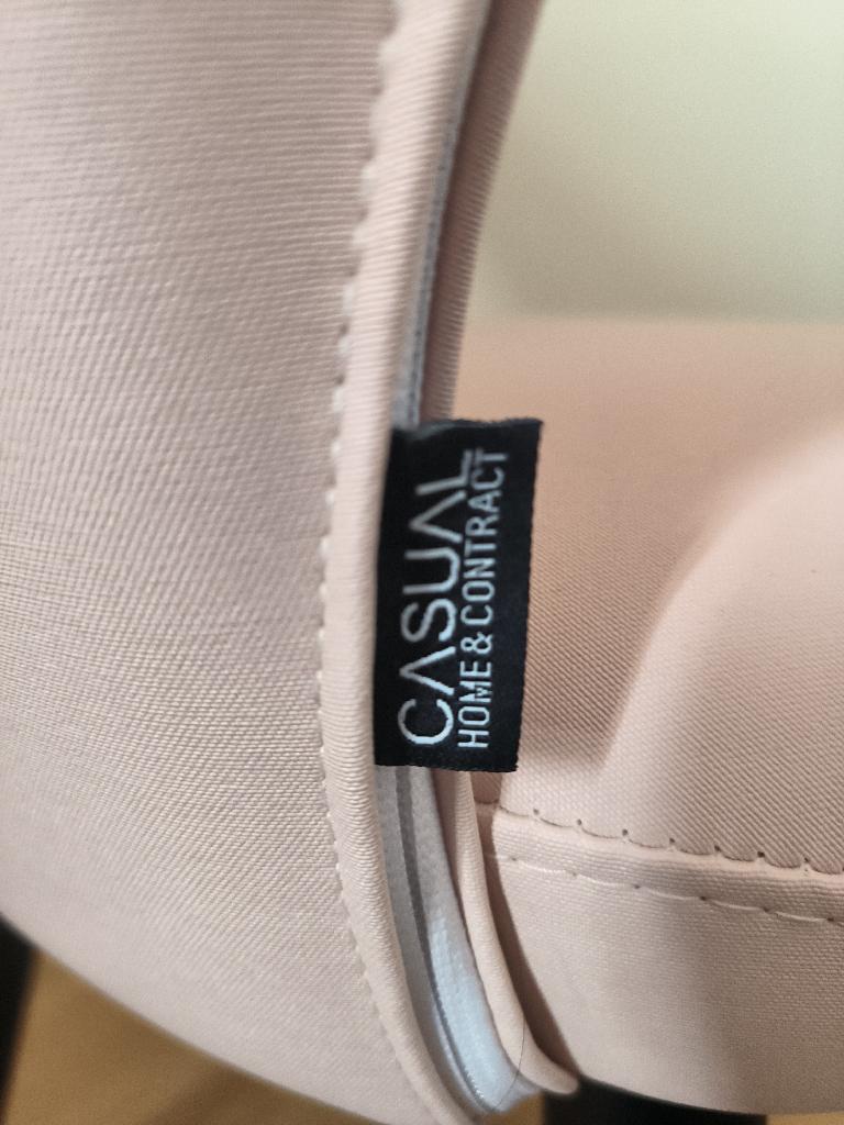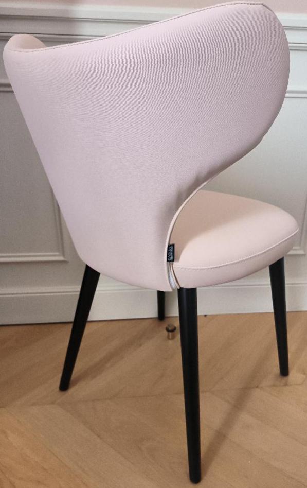 Chaise de marque Casual, dossier et assise en tissu synthétique de couleur rose pâle reposant sur 4 pieds en bois noir. Dim : 80 x 50 x 52 cm. 6 unités. Vendu à l’unité avec faculté de réunion. Localisation: BLB, 3 rue de la Fossé aux Leux – 91700 Sainte Geneviève des Bois