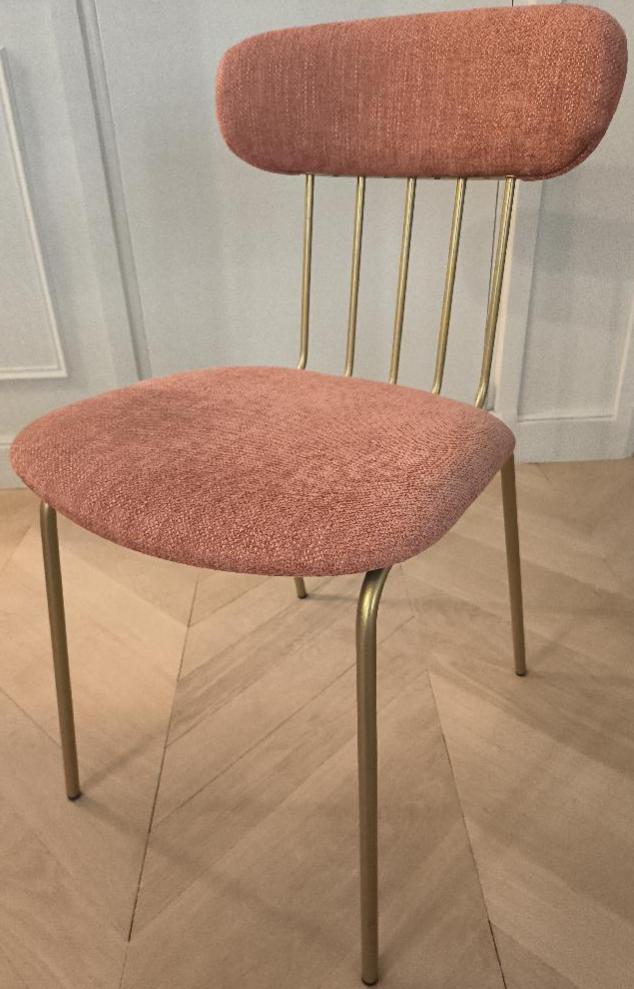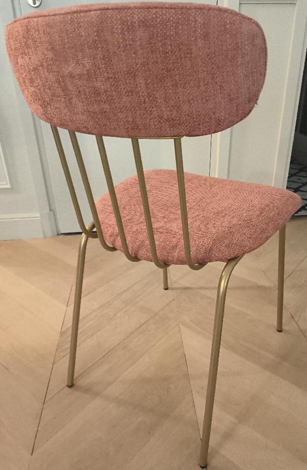 Chaise de marque Casual modèle Miki en acier de couleur doré, dossier et assise en tissu rose. Dim : 84 x 47 x 54 cm. (étiquette 296). Localisation: BLB, 3 rue de la Fossé aux Leux – 91700 Sainte Geneviève des Bois