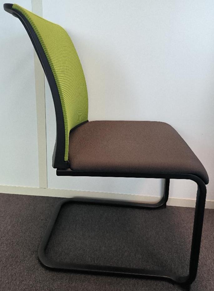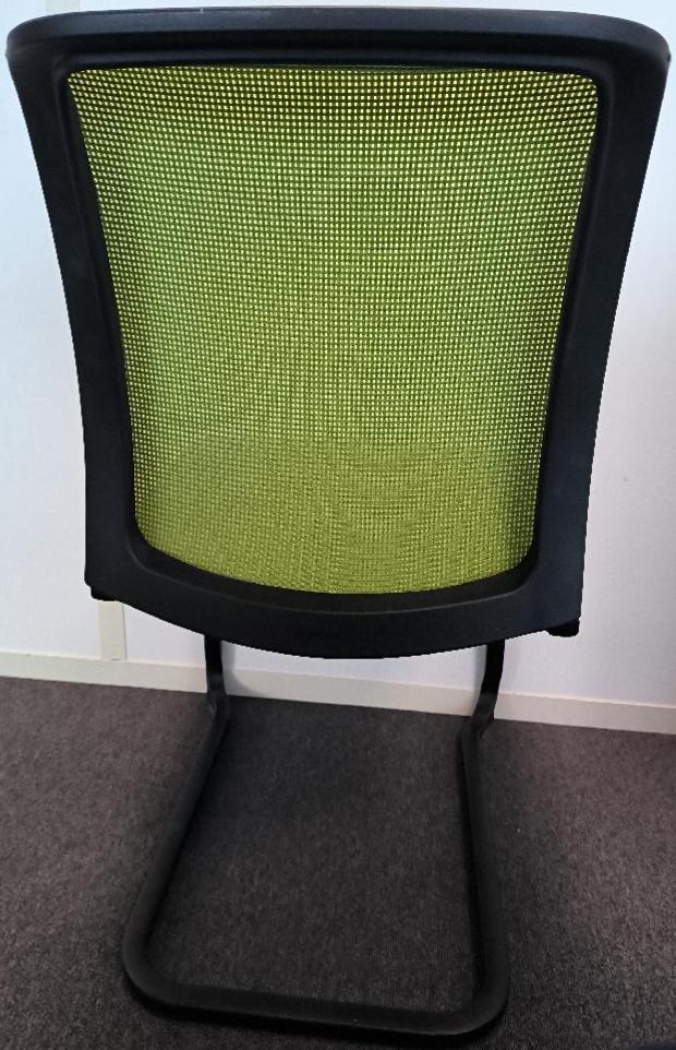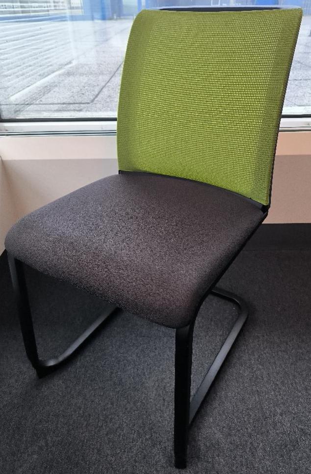 Chaise de marque Steelcase empilable, assise en tissu de couleur gris anthracite, dossier en tissu résille de couleur vert pomme, piétement porte-à-faux en métal noir. Dim : 84 x 45 x 60 cm. 103 UNITÉS AU TOTAL. (étiquette 5029)