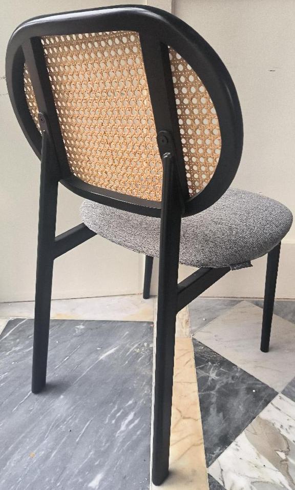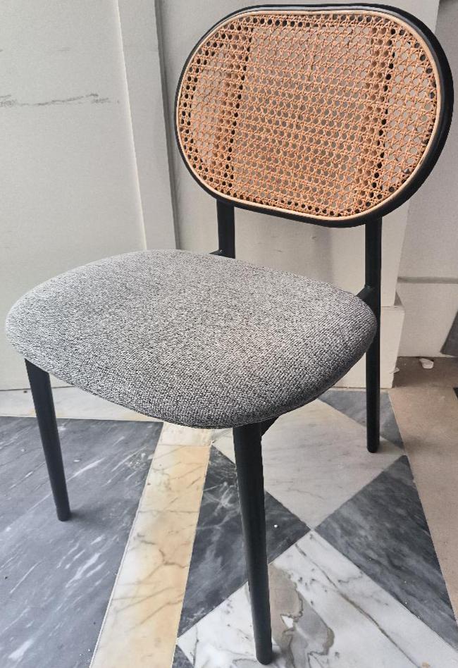 Chaise de marque Zuiver modèle Spike, structure en bois et métal, dossier en cannage de rotin et assise recouverte de tissu de couleur gris. Dim : 80 x 50 x 60 cm. 15 unités. Vendu à l’unité avec faculté de réunion. Localisation: BLB, 3 rue de la Fossé aux Leux – 91700 Sainte Geneviève des Bois