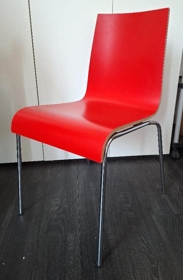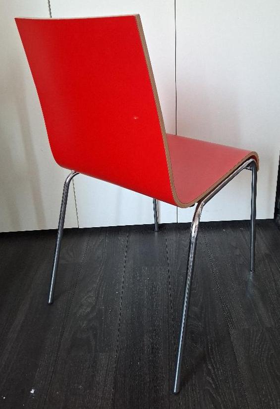 Chaise empilable, coque en bois contreplaqué laqué rouge, piétement en acier tubulaire chromé. 81 x 44 x 55 cm. 8 unités. Vendu à l’unité avec faculté de réunion. Localisation: 30 rue Beauregard – 60440 Nanteuil-Le-Haudouin