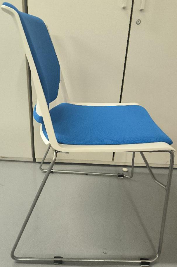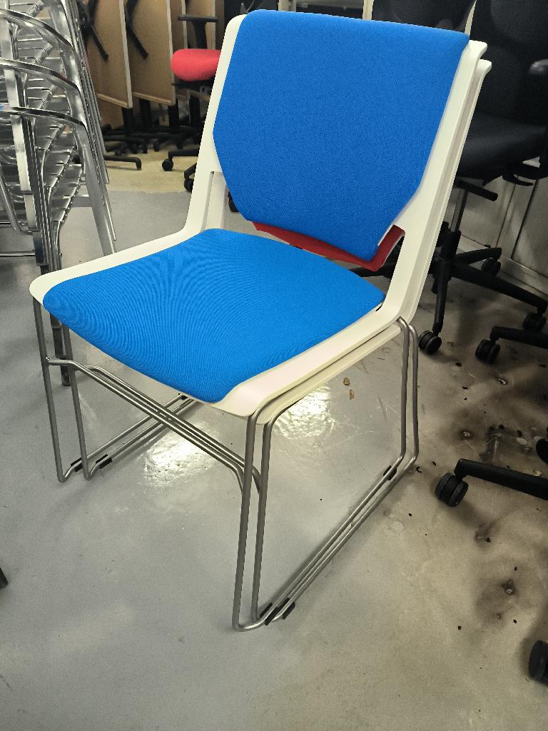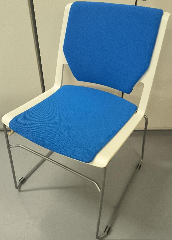 Chaise empilable de marque Haworth, structure en plastique blanc, dossier et assise en tissu bleu électrique, piétement en métal de couleur gris. Dim : 82 x 48 x 58 cm. 10 UNITÉS AU TOTAL. (étiquette 5100) Niveau -1 réserve : 10 unités