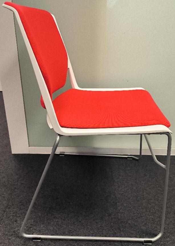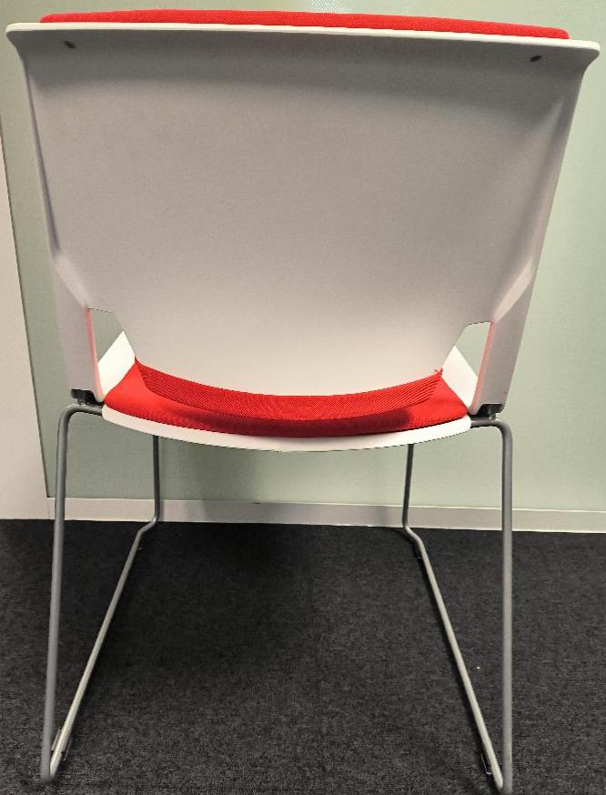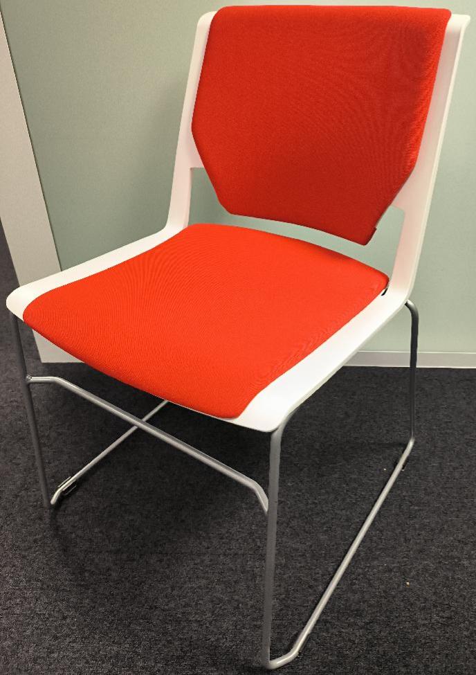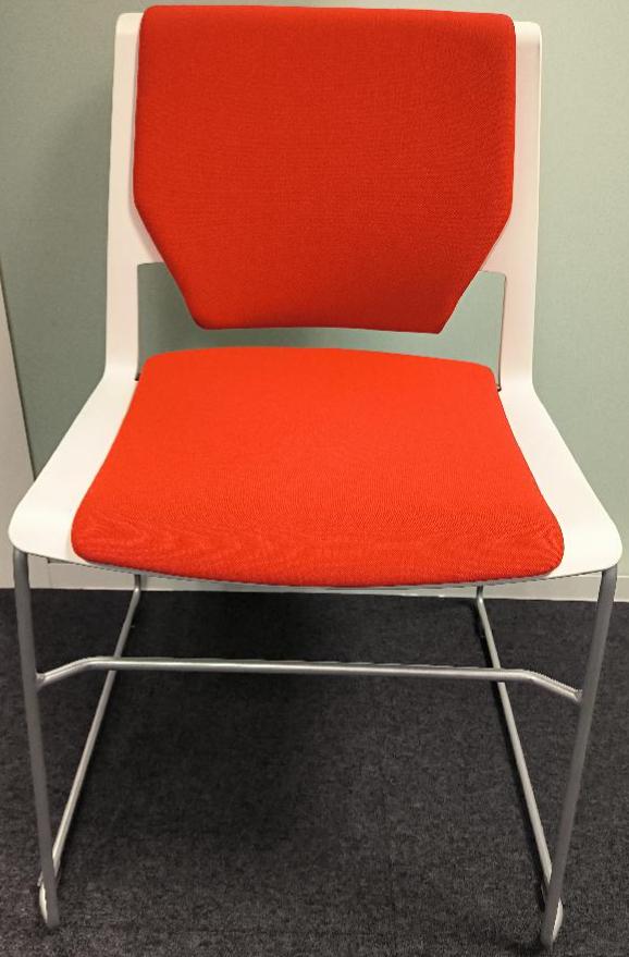 Chaise empilable de marque Haworth, structure en plastique blanc, dossier et assise en tissu rouge orangé, piétement en métal de couleur gris. Dim : 82 x 48 x 58 cm. 18 UNITÉS AU TOTAL. (étiquette 5013)