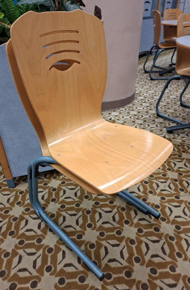 Chaise empilable de marque MMO en bois contreplaqué à dossier ajouré, piétement en métal en porte-à-faux.  88 x 44 x 55 cm. 300 unités. Localisation: Rie – Image 4