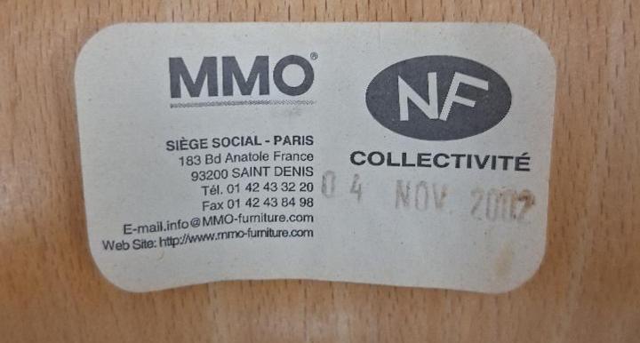 Chaise empilable de marque MMO en bois contreplaqué à dossier ajouré, piétement en métal en porte-à-faux. 88 x 44 x 55 cm. 300 unités. Localisation: Rie