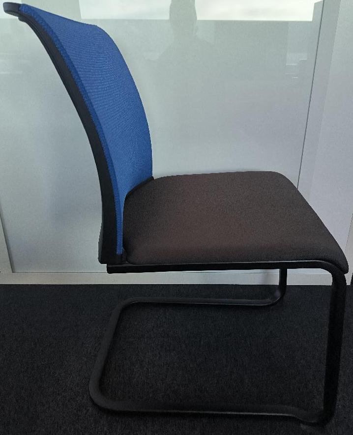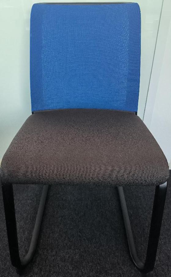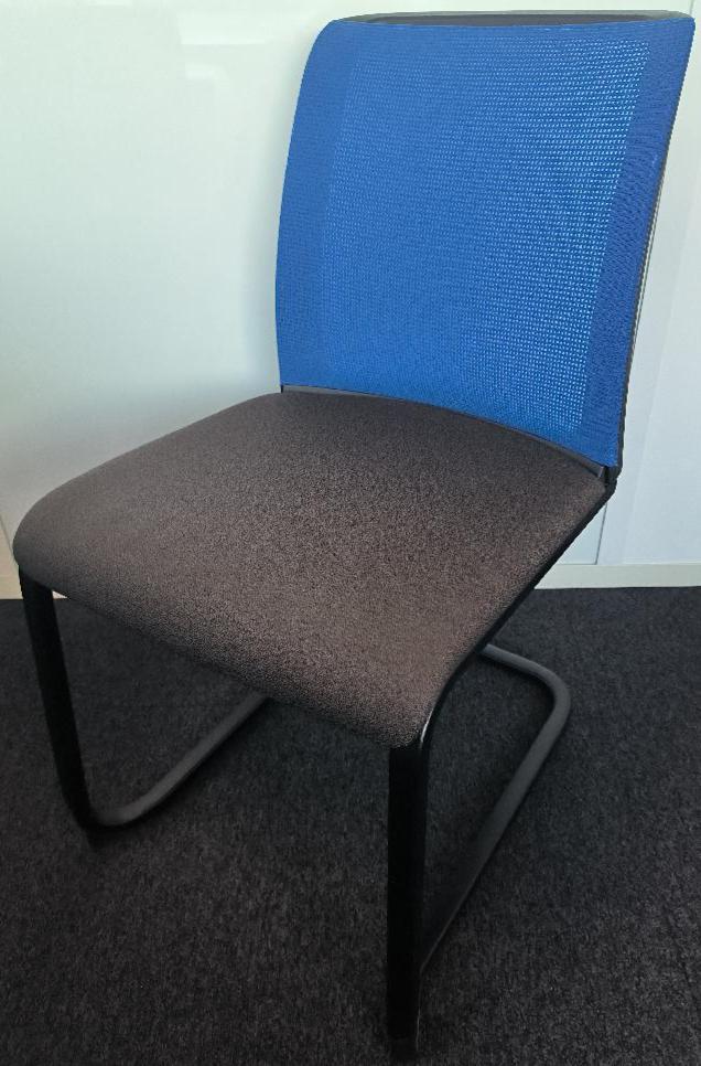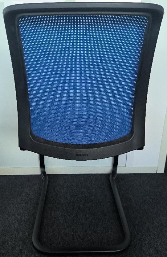 Chaise empilable de marque Steelcase, assise en tissu de couleur gris anthracite, dossier en tissu résille de couleur bleu électrique, piétement porte-à-faux en métal noir. Dim : 84 x 45 x 60 cm. 110 UNITÉS AU TOTAL. (étiquette 5021)