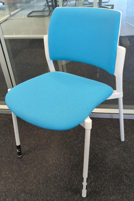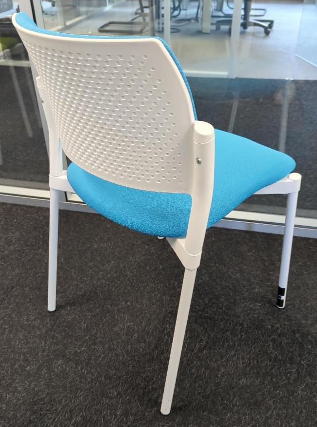 Chaise empilable design Paolo Scagnellato modèle Kyos édition Sokoa, armature en plastique blanc, assise et dossier en tissu bleu, piètement en métal. 80 x 53 x 54 cm. 2 unités. Vendu à l’unité avec faculté de réunion. (2 bât M 1er + 3 rdj près salon)
