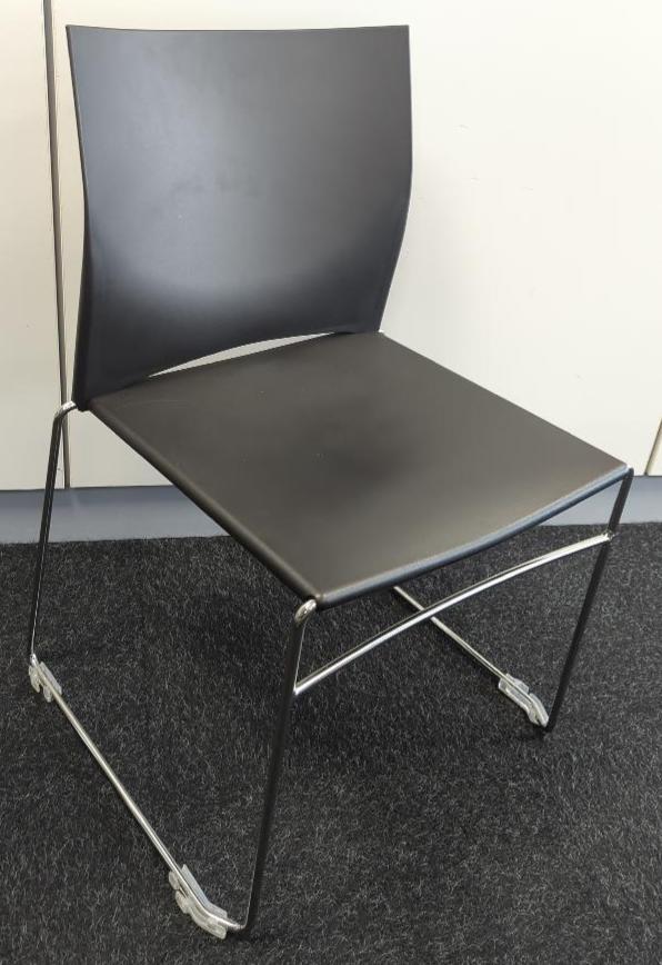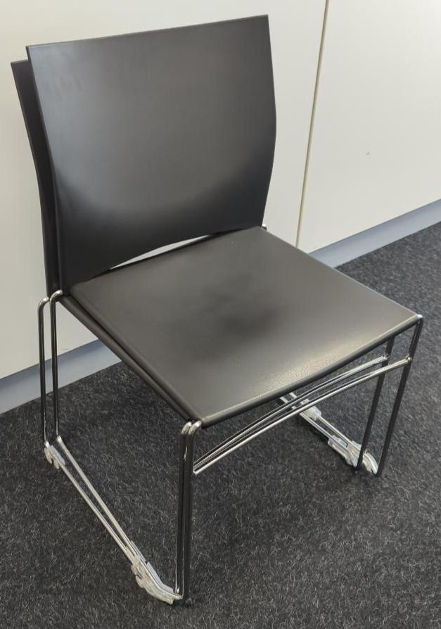 Chaise empilable, structure en acier tubulaire chromé, dossier et assise en plastique noir. 82 x 51 x 52 cm. 56 unités. Vendu à l’unité avec faculté de réunion. (13 unités rdc salle Silverstone + 13 rdj salle Carnot + 30 rdj salle Valencia)