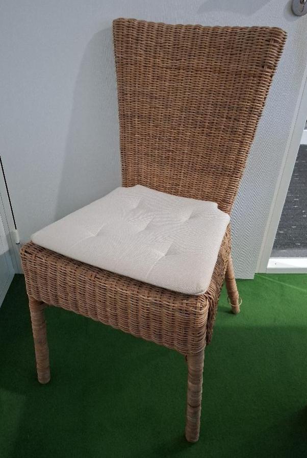 Chaise en rotin avec galette d’assise en tissu beige. 90 x 46 x 50 cm. 3 unités. Vendu à l’unité avec faculté de réunion. (1er). Localisation: 10 rue d’Arcueil – 94150 Rungis