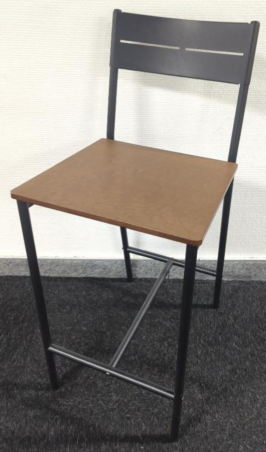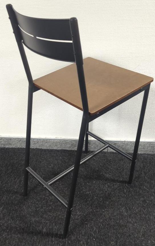 Chaise haute, assise en bois, structure en acier laqué noir. 90 x 39 x 40 cm. 4 unités. Vendu à l’unité avec faculté de réunion. (rdj)