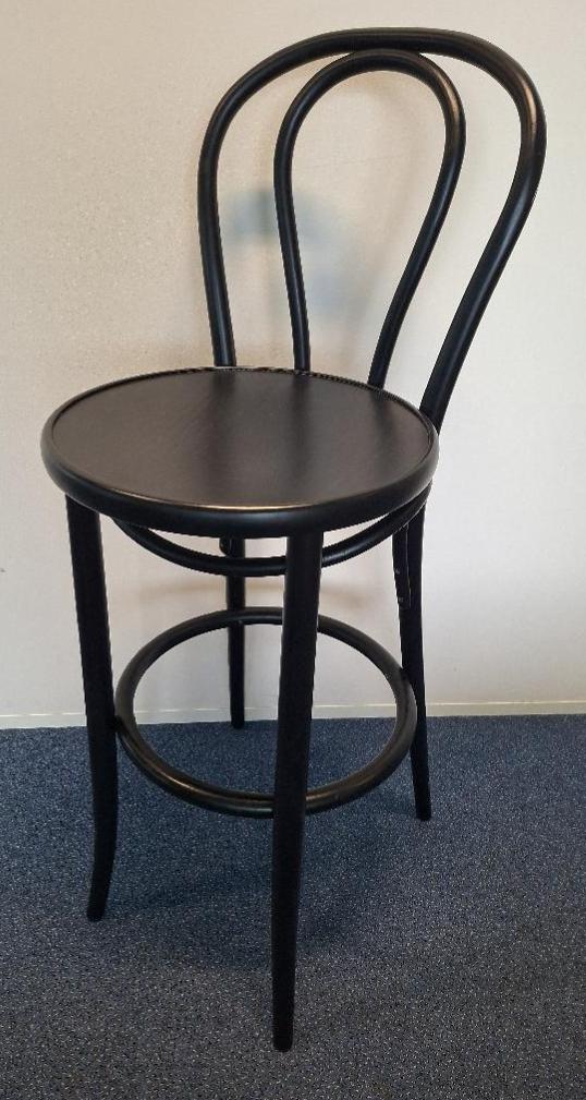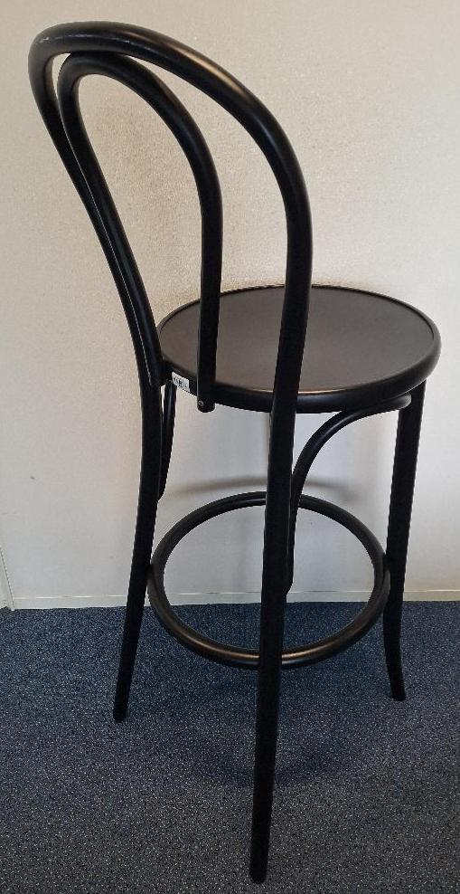 Chaise haute de bar en bois laqué noir de marque Ton. 111 x 40 x 45 cm. 4 unités. Vendu à l'unité avec faculté de réunion. Localisation: Tour Coeur Défense - 92400 Courbevoie (TA 26ème)