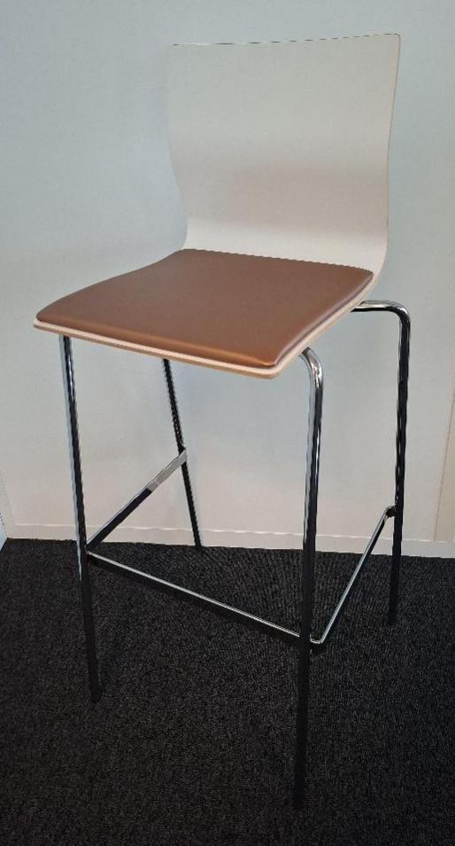 Chaise haute empilable de marque Materia, coque en bois stratifié blanc, galette d'assise en cuir bronze doré, piétement en acier chromé. 106 x 45 x 44 cm. 1 unité. Localisation: 6ème étage salle 607
