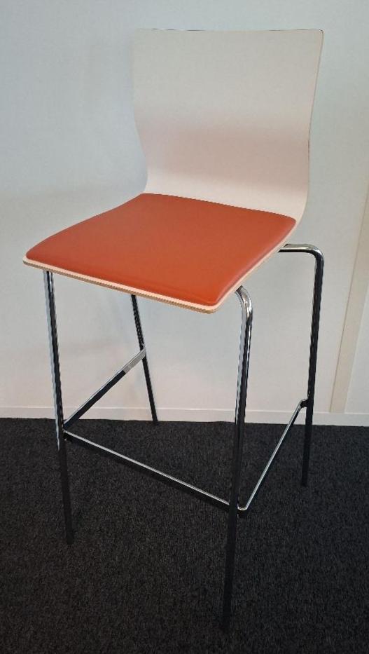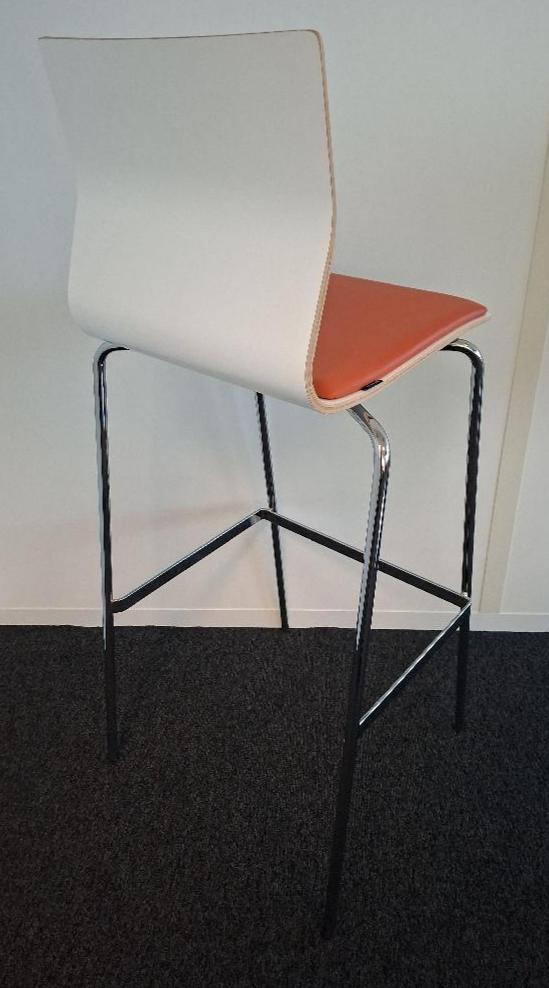 Chaise haute empilable de marque Materia, coque en bois stratifié blanc, galette d’assise en cuir saumon, piétement en acier chromé. 106 x 45 x 44 cm. 1 unité. Localisation: 6ème étage salle 607
