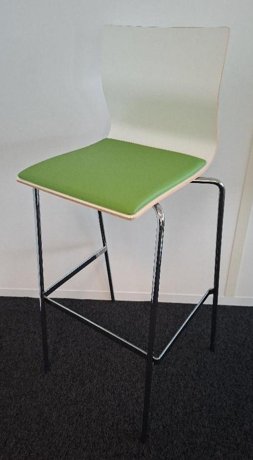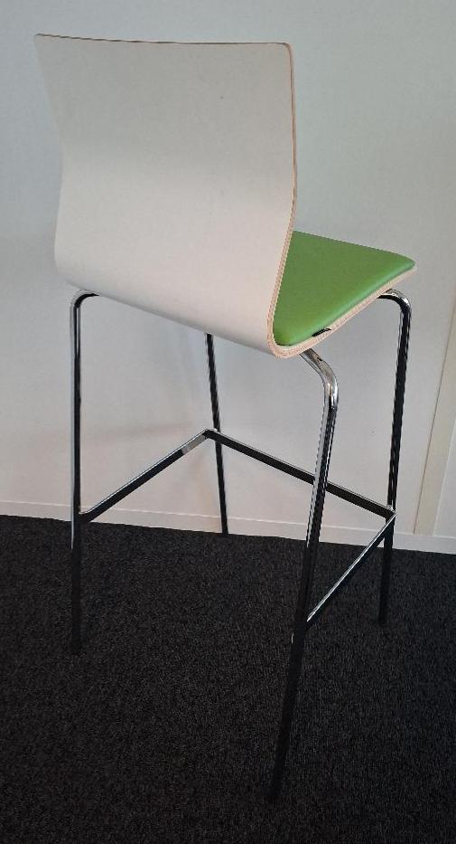 Chaise haute empilable de marque Materia, coque en bois stratifié blanc, galette d’assise en cuir vert, piétement en acier chromé. 106 x 45 x 44 cm. 1 unité. Localisation: 6ème étage salle 607
