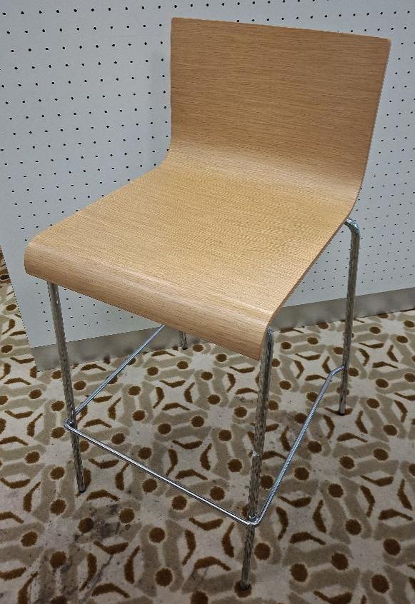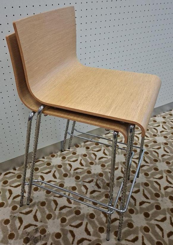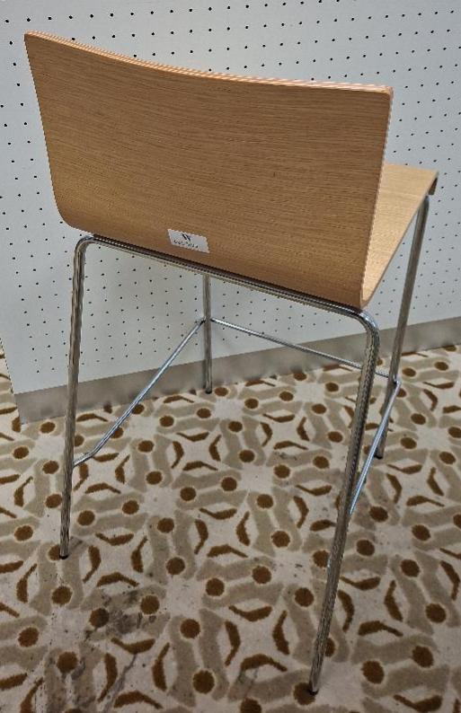 Chaise haute empilable modèle Kuadra édition Pedrali, coque en bois contreplaqué, piétement en acier chromé. 91 x 43 x 52 cm. 72 unités. Localisation: Rie