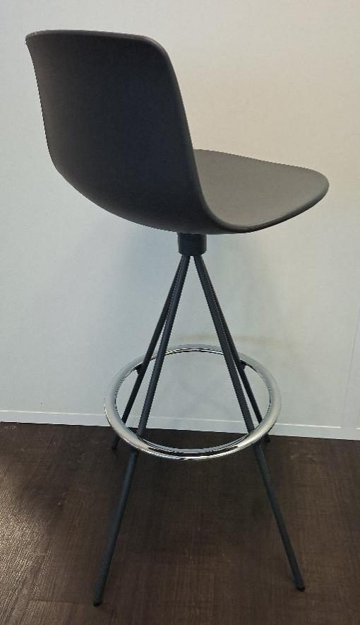 Chaise haute pivotante design Altherr Lievore Molina modèle Lottus édition Enea, coque en polypropylène gris anthracite, piétement oblique en acier laqué gris avec repose-pied en acier chromé. 99 x 44 x 45 cm. 76 unités. Localisation: 5ème étage (20 unités) / 4ème étage (6 unités) / 3ème étage (6 unités) / 2ème étage (6 unités) / 1er cafet (33 unités) / Accueil (3 unités) / Auditorium (2 unités)