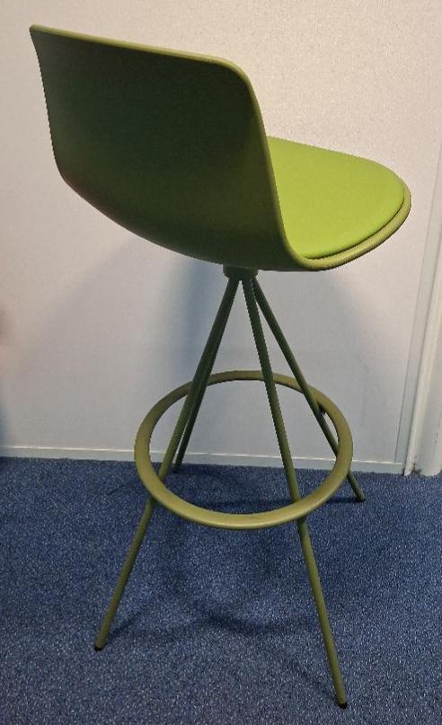 Chaise haute pivotante design Lievore Altherr Molina modèle Lottus édition Enea, coque en polypropylène vert, galette d’assise en simili cuir, piétement oblique en acier laqué vert avec repose-pied circulaire. 98 x 44 x 51 cm. 4 unités. Vendu à l’unité avec faculté de réunion. Localisation: Tour Coeur Défense – 92400 Courbevoie (TA 26ème)