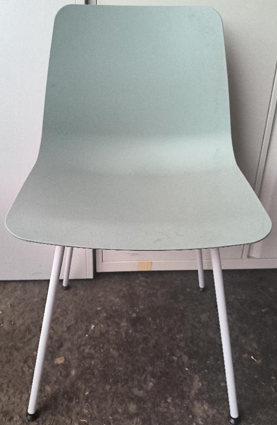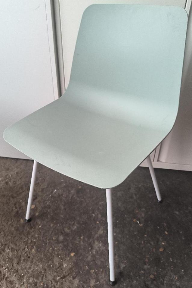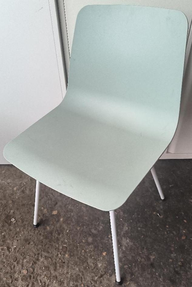 Chaise non empilable design Simon Pengelly modèle Varya édition Inclass, coque en polypropylène de couleur vert de gris, piétement en acier de couleur blanc. Dim : 81 x 48 x 50 cm . 6 unités. Vendu à l’unité avec faculté de réunion. Localisation : 30 rue Beauregard – 60440 Nanteuil-le-Haudouin