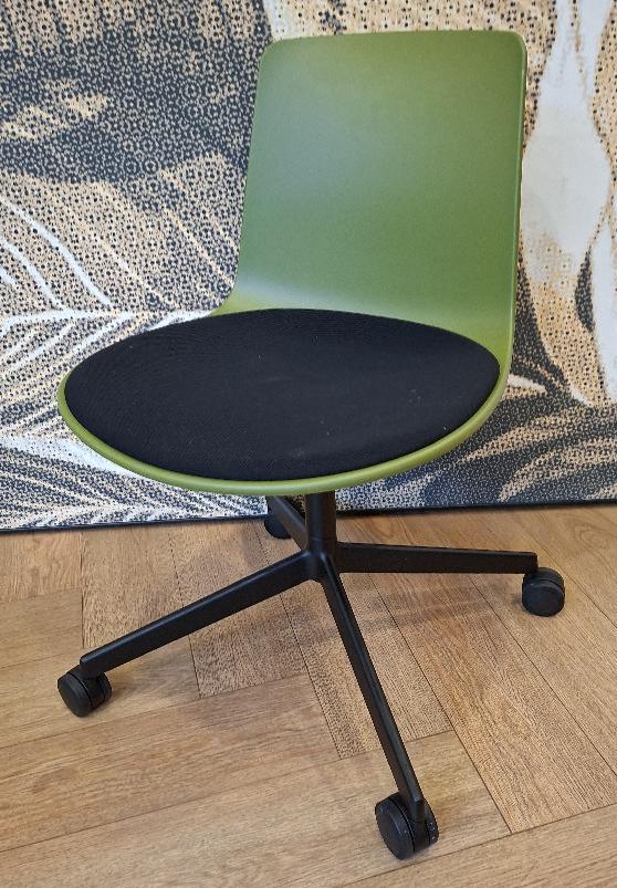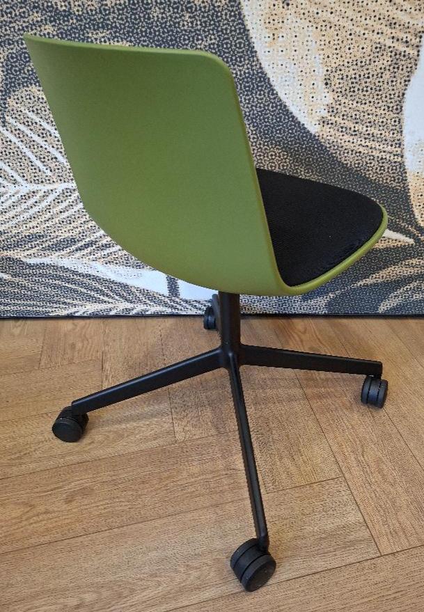 Chaise pivotante sur roulettes de marque Enea, coque en polypropylène vert, galette d’assise en tissu noir, piètement en étoile à 4 branches en acier laqué noir. 78 x 46 x 55 cm. 3 unités. Vendu à l’unité avec faculté de réunion. Localisation: Tour Coeur Défense – 92400 Courbevoie (TA cafet)